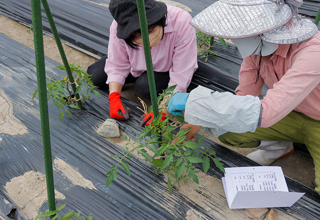 伸びてきたトマト・ナスの脇芽とり取り誘引をしていきます。