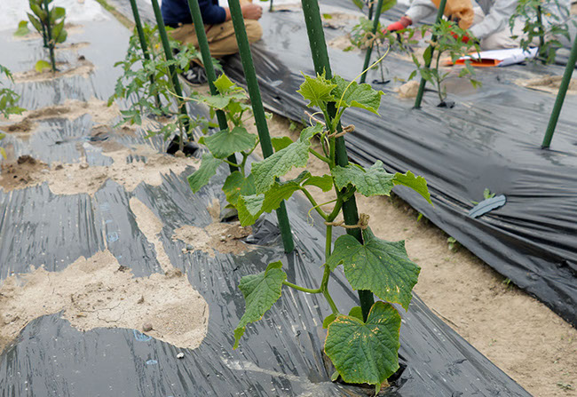 キュウリは5節目までの側枝と雌花をそのままにすると主枝の伸びが悪くなるのでかきとります。