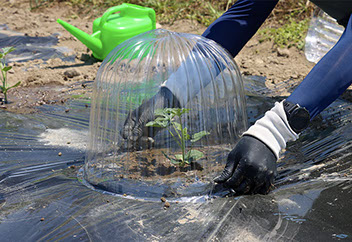 セルトレイから苗を抜き取り根鉢の表面と畝の表面が同じ高さになるように植えます。両手の親指と人差し指で根本の周りを押さえ隙間がないようにします。