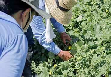 生産者(前田さん)「今年の梨瓜は、梅雨が早かったのか温度が上がってきても花の咲きが良くなく交配がうまくいかない、ミツバチがいれば良いのですが人口授粉です。」ウリハムシの予防についての農薬の説明していただき、「湿って草まみれになるとナメクジが出てくるので、綺麗に畑をしていれば、農薬は無くてもナメクジは出ない。」とのことです。