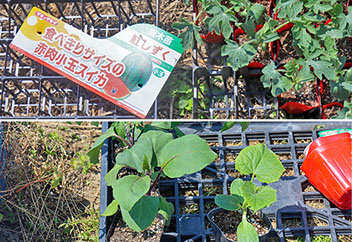 トマト(桃太郎ピース)、キュウり(VR夏すずみ)、ナス(千両二号)、スイカ(紅しずく)の苗を