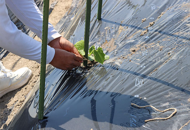 すいかの苗は定植後、苗帽子をかぶせて針金で固定します。