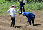 気持ちの良い晴天です。 合掌式支柱が並んでいます。苗を植える場所を決めていきます。