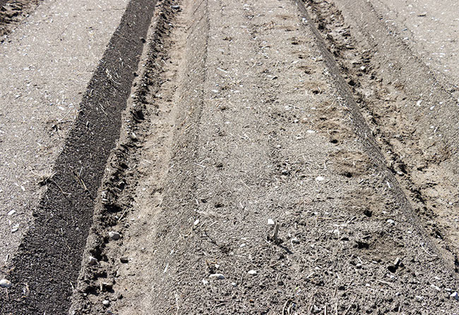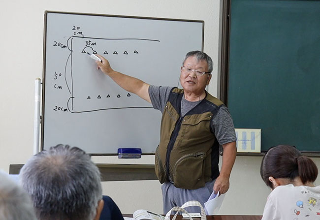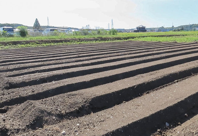 株間35cm×条間50cmの 2条(千鳥)植えになるよう間隔を測ります。
