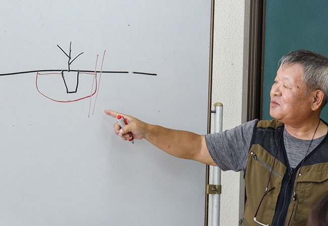人差し指の第二関節まで入る(深さ5cm)の植穴を(36カ所)作ります。